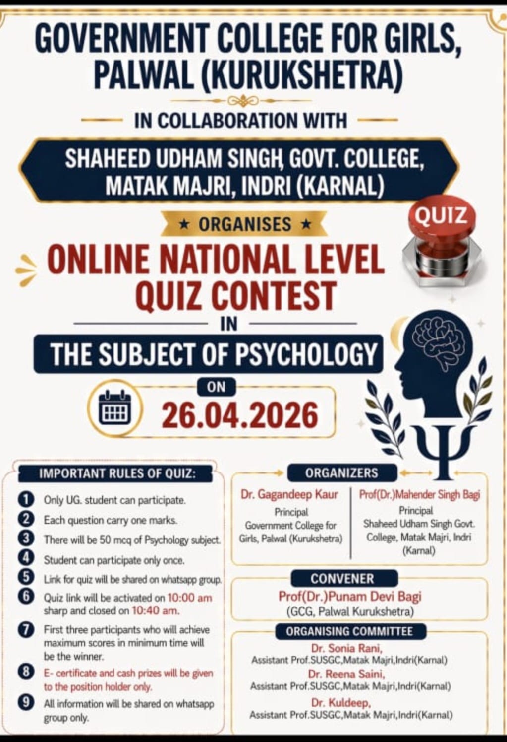 इंद्री विजय कांबोज।। राजकीय कन्या महाविद्यालय, पलवल (कुरुक्षेत्र) के मनोविज्ञान विभाग द्वारा एवं शहीद उधम सिंह राजकीय महाविद्यालय, मटक माजरी, इंद्री (करनाल) के सहयोग से ऑनलाइन राष्ट्रीय स्तर की मनोविज्ञान प्रश्नोत्तरी प्रतियोगिता का सफलतापूर्वक आयोजन किया गया। इस प्रतियोगिता में देशभर के विभिन्न महाविद्यालयों एवं विश्वविदयालयो के विद्यार्थियों ने उत्साहपूर्वक भाग लिया। कार्यक्रम का उद्देश्य मनोविज्ञान एवं संबंधित विषयों के प्रति जागरूकता, ज्ञान एवं तार्किक क्षमता का विकास करना था।