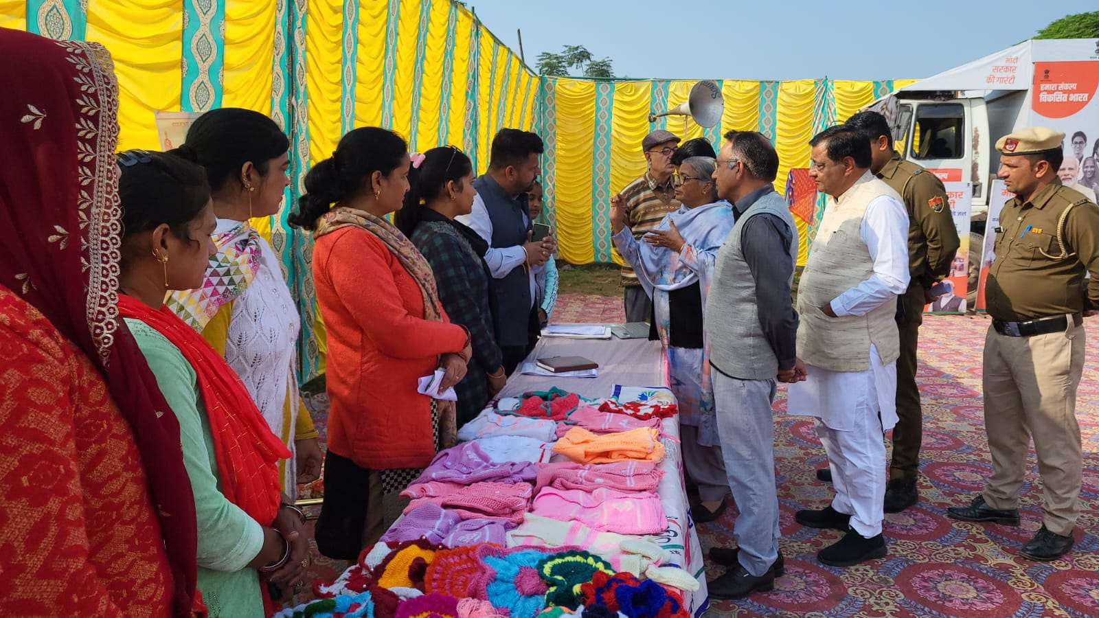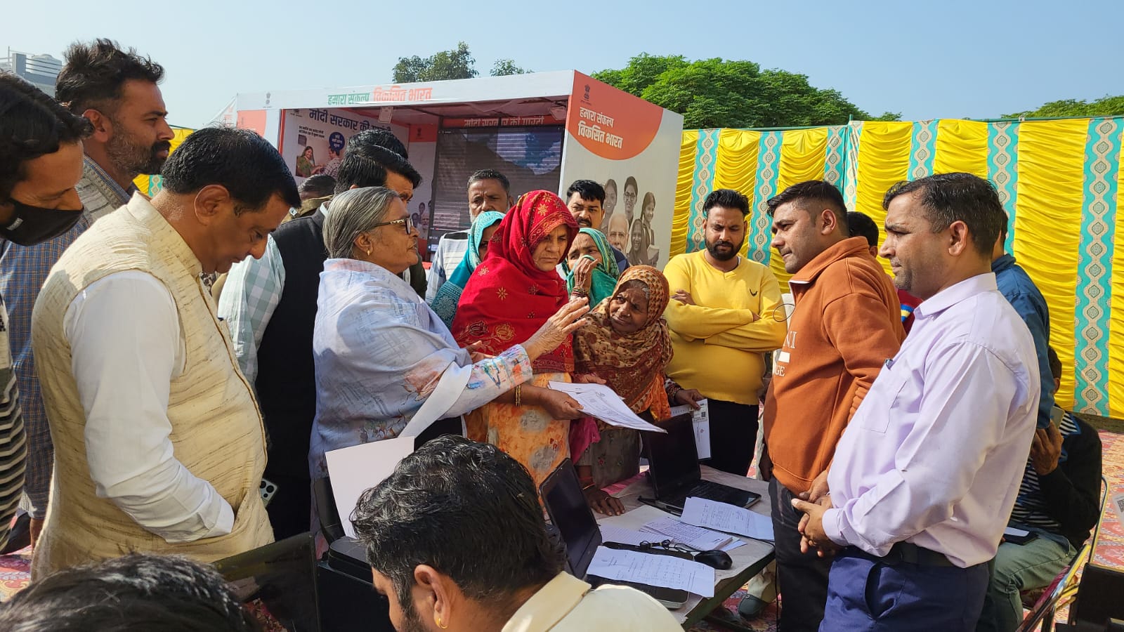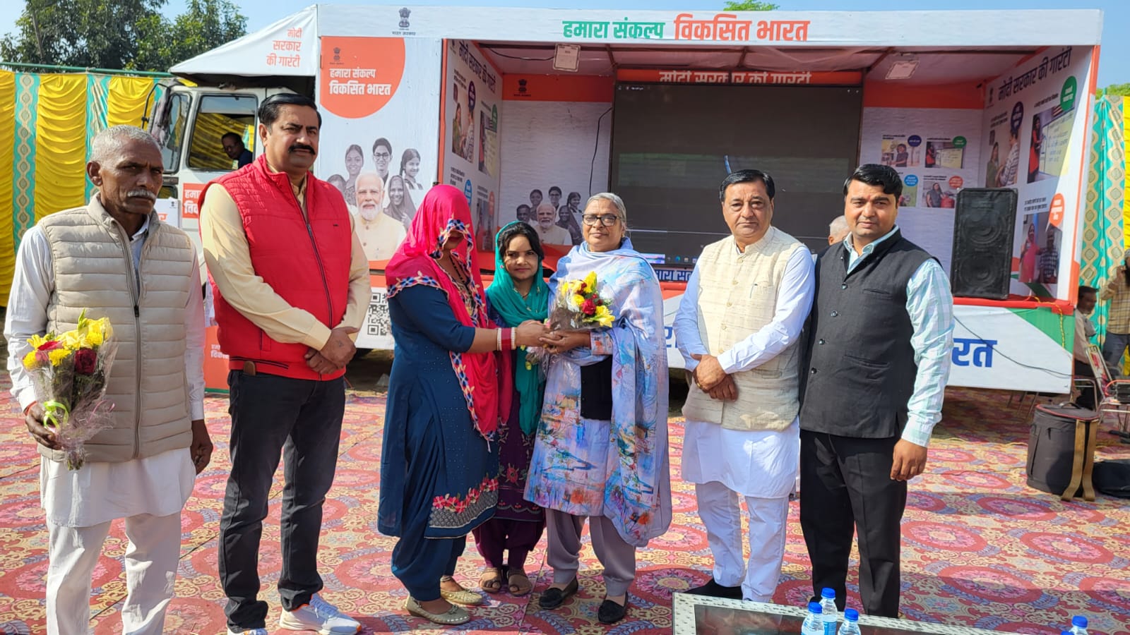 गांगर में सरपंच नेहा ने निर्मला बैरागी और नगला रोड़ान में जसविंद्र ने अमरनाथ सौदा का पुष्प गुच्छ देकर स्वागत किया गया। इसके बाद मुख्य अतिथियों ने विभिन्न विभागों की ओर से लगाये गये स्टाल्स का अवलोकन किया और लोगों से बातचीत की। इस मौके पर प्रधानमंत्री नरेंद्र मोदी का संदेश सुनाया गया और हरियाणा में हुये विकास कार्यों से संबंधित लघु फिल्म दिखाई गई। गांगर में भाजपा जिला उपाध्यक्ष सुमेरचंद कंबोज और नगला रोड़ान में मुख्य अतिथि ने संकल्प शपथ दिलाई।चेयरपर्सन निर्मला बैरागी ने इस मौके पर कहा कि सरकार ने महिला सशक्तिकरण के लिये अनेक कदम उठाये हैं। सरकार का संकल्प है कि पंक्ति में सबसे पीछे खड़े व्यक्ति तक सरकारी योजनाओं का लाभ पहुंचे। उन्होंने कार्यकर्ताओं से यह सुनिश्चित करने की अपील की कि कोई पात्र व्यक्ति योजनाओं के लाभ से वंचित न रहे। उन्होंने कहा कि सरकार ने पंचायतों में महिलाओं को 50 प्रतिशत आरक्षण दिया है। उज्ज्वला योजना के तहत लाखों महिलाओं को गैस कनेकशन उपलब्ध कराये गये हैं। घर-घर शौचालयों का निर्माण कराया गया है। महिला शिक्षा को बढ़ावा देने के लिये राज्य में 32 कालेज खोले गये हैं। सरकार व जनता के सहयोग से राज्य में लिंगानुपात बढक़र 932 हो गया है जो 2014 में 837 था। प्रधानमंत्री गरीब कल्याण योजना के तहत 42 लाख परिवारों को मुफ्त राशन दिया जा रहा है। सामाजिक