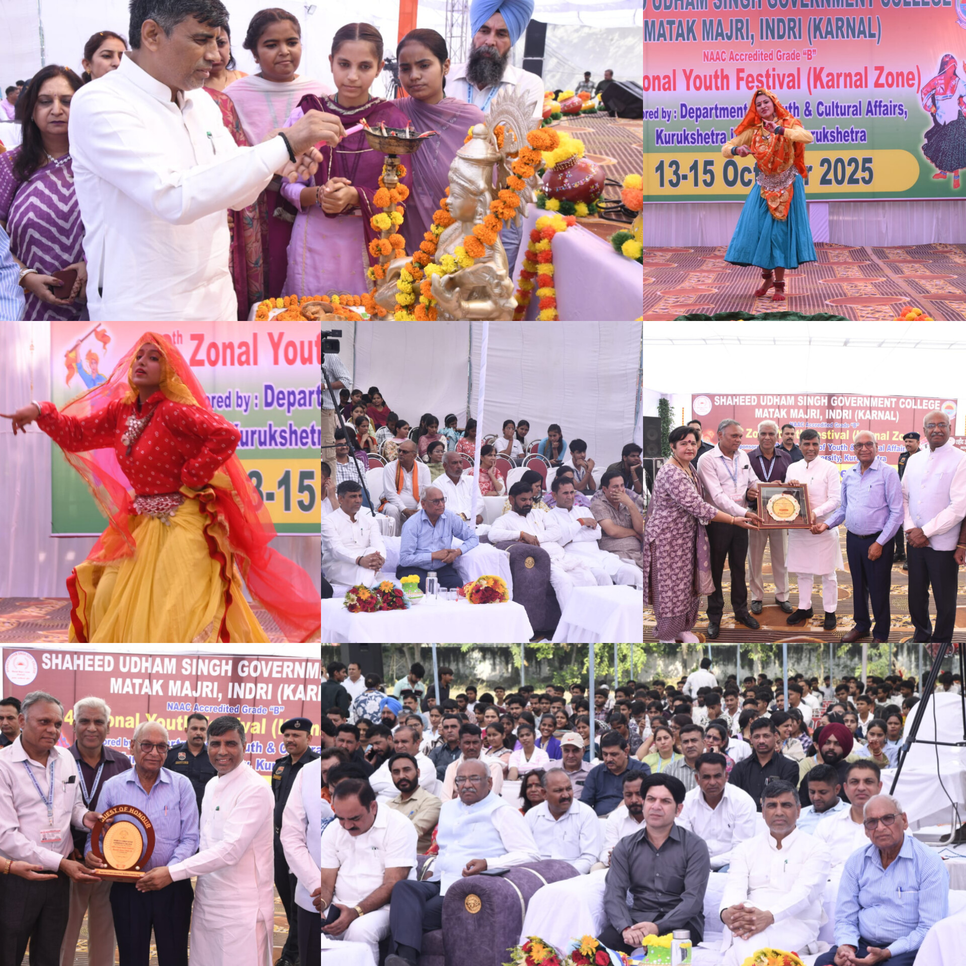 इंद्री विजय कांबोज।। शहीद उधम सिंह राजकीय महाविद्यालय, मटक माजरी, इंद्री करनाल में युवा एवं सांस्कृतिक विभाग, कुरुक्षेत्र विश्वविद्यालय, कुरुक्षेत्र के तत्वावधान एवं उच्चतर शिक्षा विभाग, पंचकूला के निर्देशानुसार आयोजित तीन दिवसीय क्षेत्रीय युवा महोत्सव (13 से 15 अक्तूबर 2025) का शुभारंभ आज हरियाणा के  शिक्षा मंत्री श्री महिपाल ढांडा के कर-कमलों द्वारा हुआ। कार्यक्रम की अध्यक्षता महाविद्यालय के प्राचार्य डॉ. महेन्द्र सिंह बागी ने की। महोत्सव का आयोजन संयोजिका डॉ. मीरा कश्यप एवं सह-संयोजिका डॉ. भारती के कुशल पर्यवेक्षण में किया जा रहा है। इस अवसर पर मुख्य अतिथि के रूप में  शिक्षा मंत्री  महिपाल ढांडा ने उत्सव का उद्घाटन किया। उनके साथ  राम कुमार कश्यप, माननीय विधायक, इंद्री (करनाल) भी विशेष अतिथि के रूप में शिरकत की।डॉ अनीता जून जिला उच्चतर शिक्षा अधिकारी करनाल, डॉ विवेक चावला, डायरेक्टर ऑफ़ यूथ एंड कल्चर डिपार्टमेंट, कुरुक्षेत्र यूनिवर्सिटी, एस.डी.एम. अशोक मुंजाल, इंद्री, डी. एस . पी.  सतीश गौतम, इंद्री, डॉ राजेश रांझा, प्रधान, हरियाणा गवर्नमेंट कॉलेज टीचर एसोसिएशन, डॉ रिशिपाल प्राचार्य, जनता कॉलेज, कौल से उपस्थित रहे। मुख्य अतिथि एवं विशेष अतिथियों के आगमन पर महाविद्यालय प्राचार्य डॉ महेन्द्र सिंह बागी एवं कॉलेज काउंसिल के सदस्यों डॉ सुरेन्द्र सिंह, डॉ राजकुमार, डॉ अनिल कुमारी, डॉ रणबीर सिंह, डॉ शालिनी, डॉ मीरा कश्यप एवं डॉ दीपा शर्मा ने पुष्पगुच्छ देकर उनका स्वागत किया। सभी शैक्षणिक एवं गैर शैक्षणिक सदस्यों ने गर्मजोशी से मुख्य अतिथि एवं विशेष अतिथि का स्वागत किया। महाविद्यालय में उनके आगमन पर एन. सी. सी. के कैडेट्स द्वारा गार्ड ऑफ ऑनर एन. सी. सी. के प्रभारी कैप्टेन डॉ रणबीर सिंह की अगुवाई में दिया गया। तदोपरांत अतिथियों के द्वारा शहीद उधम सिंह की प्रतिमा पर पुष्पांजलि अर्पित की गई।महाविद्यालय में विविध प्रदर्शनियों का आयोजन किया गया, जिनमें विशेष आकर्षण रहा हरियाणवी संस्कृति की झलक प्रस्तुत करने वाली “सांझी” प्रदर्शनी, जिसने क्षेत्रीय लोक संस्कृति और परंपराओं को सुंदर ढंग से अभिव्यक्त किया। कार्यक्रम का शुभारंभ महाविद्यालय परिसर में मुख्य अतिथि द्वारा दीप प्रज्वलन के साथ हुआ।महाविद्यालय के प्राचार्य, डॉ. महेन्द्र सिंह बागी ने अपने उद्घाटन भाषण में संस्थान की उपलब्धियों, ऐतिहासिक पृष्ठभूमि और भविष्य की योजनाओं पर प्रकाश डाला।यह उत्सव न केवल प्रतिभाओं को मंच प्रदान करता है, बल्कि युवाओं में सृजनशीलता, अनुशासन, सहयोग और राष्ट्रीय एकता की भावना को भी प्रोत्साहित करता है।युवा शक्ति किसी भी राष्ट्र की सबसे बड़ी पूँजी होती है। ऐसे सांस्कृतिक आयोजनों के माध्यम 