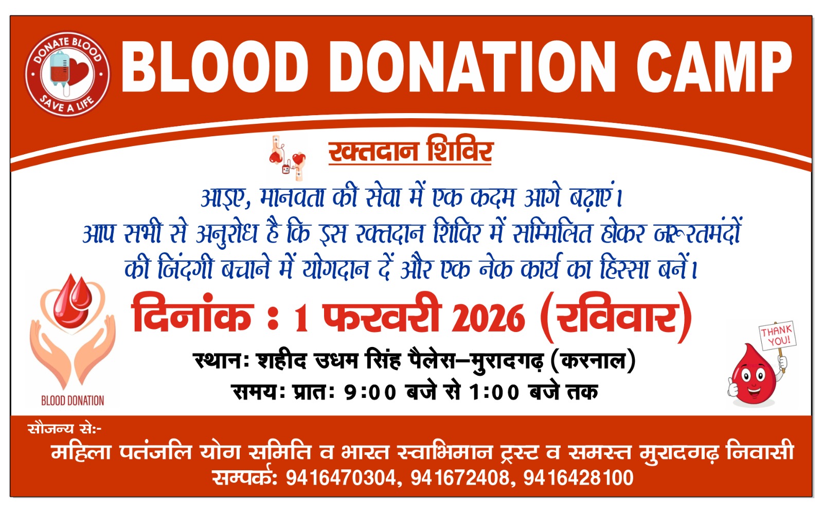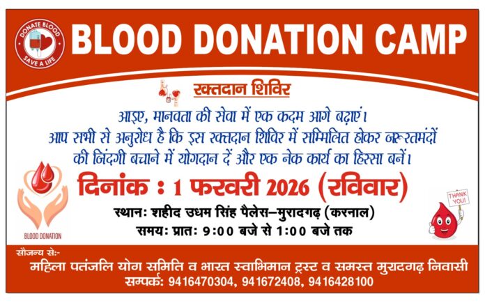 उपमंड़ल के गांव मुरादगढ़ के शहीद उधम सिंह पैलेस में 1 फरवरी दिन रविवार को एक विशाल रक्तदान शिविर का आयोजन किया जाएगा। यह रक्तदान शिविर महिला पंतजलि योग समिति, भारत स्वाभिमान ट्रस्ट व समस्त गांववासियों के सहयोग से लगाया जा रहा है। इस बारे में जानकारी देते हुए योग प्रशिक्षक बलराज कांबोज ने बताया कि जरूरतमंदों को रक्त की कमी ना आने पाए इसके लिए इस रक्तदान शिविर का आयोजन किया जा रहा है। उन्होंने कहा कि रक्तदान करना एक पुनीत कार्य है जिससे किसी के जीवन को बचाया जा सकता है। रक्तदान करने से शरीर में कोई कमजोरी नहीं आती है। हमें अपने खुशी के मौकों पर रक्तदान अवश्य करना चाहिए। उन्होंने बताया कि यह रक्तदान शिविर सुबह 9 बजे से दोपहर 1 बजे तक चलेगा। आप सब से अपील है कि इस रक्तदान शिविर में बढ़चढ़ कर भाग लेकर पुण्य के भागी बने।
