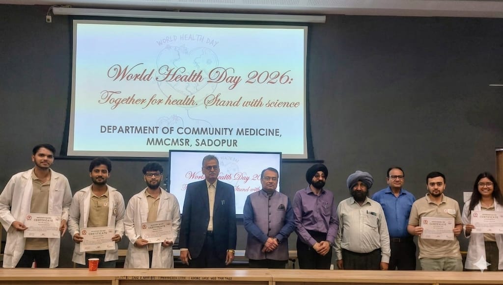 अंबाला अनिल शर्मा ।। महर्षि मार्कंडेश्वर कॉलेज ऑफ मेडिकल साइंसेज़ एंड रिसर्च (एमएमसीएमएसआर), सदोपुर के कम्युनिटी मेडिसिन विभाग द्वारा विश्व स्वास्थ्य दिवस के अवसर पर जागरूकता कार्यक्रम का सफल आयोजन किया गया। यह कार्यक्रम मीनाक्षी मैम के नेतृत्व में प्रधानाचार्य डॉ. सुखमिंदर जीत सिंह बाजवा, चिकित्सा अधीक्षक डॉ. अतुल जैन के मार्गदर्शन तथा विभागाध्यक्ष डॉ. अमरजीत सिंह की देखरेख में संपन्न हुआ।