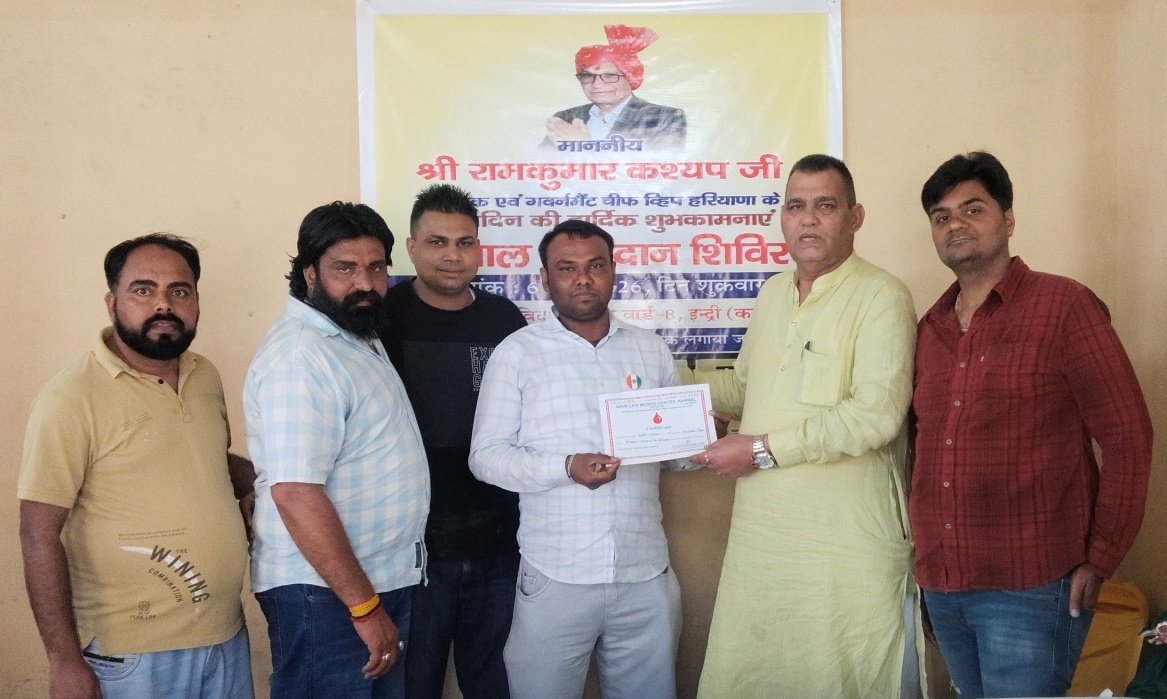 इन्द्री विजय काम्बोज ।। इन्द्री के विधायक रामकुमार कश्यप के जन्मदिन पर गुरू रविदास मंदिर इन्द्री में श्री गुरू रविदास सभा, एनजीएसयू ग्रुप हरियाणा, छत्रपति संभाजी राजे ब्रिगेड़ हरियाणा व जेम्स इंगलिश कल्ब के सौजन्य से एक विशाल रक्तदान शिविर का आयोजन किया गया। इस मौके पर काफी संख्या में पुरूषों व महिलाओं ने रक्तदान किया। रक्त एकत्रित करने में सेव लाईफ ब्लड़ सैंटर करनाल की टीम ने सहयोग किया। विधायक रामकुमार कश्यप के सुपुत्र निर्मल कश्यप ने इस रक्तदान शिविर का शुभारंभ रक्तदाताओं को बैंज लगाकर किया। उन्होंने कहा कि रक्तदान से बढक़र कोई दान नहीं है। आप के द्वारा किए गए रक्तदान से किसी जरूरतमंद की जान बचाई जा सकती है।