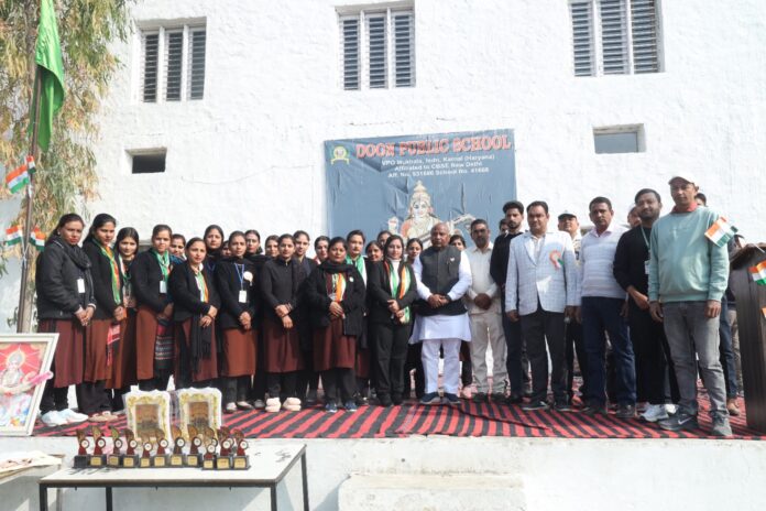इन्द्री विजय काम्बोज ।। गणतंत्र दिवस के पावन अवसर पर दून पब्लिक स्कूल में एक भव्य समारोह का आयोजन किया गया। इस कार्यक्रम में पूर्व राज्य मंत्री कर्णदेव कांबोज ने मुख्यातिथि के रूप में शिरकत कर राष्ट्रीय ध्वज फहराया। ध्वजारोहण के उपरांत पूर्व मंत्री कर्णदेव कांबोज ने विद्यार्थियों को संबोधित करते हुए आज़ादी के महत्व, गणतंत्र दिवस की गरिमा तथा भारतीय संविधान के महत्व के बारे में महत्वपूर्ण जानकारी प्रदान की। उन्होंने अपने प्रेरणादायक भाषण में स्वतंत्रता सेनानियों के अविस्मरणीय बलिदानों को याद करते हुए छात्रों को देशभक्ति और कर्तव्यनिष्ठा का संदेश दिया। इस अवसर पर विद्यालय के सभी विद्यार्थियों द्वारा देशभक्ति से ओत-प्रोत सांस्कृतिक कार्यक्रम प्रस्तुत किए गए जिनमें गीत, नृत्य एवं अन्य प्रस्तुतियाँ शामिल रहीं, जिन्हें देखकर उपस्थित सभी लोग मंत्रमुग्ध हो गए। कार्यक्रम का सफल संचालन दून पब्लिक स्कूल के सभी अध्यापकों द्वारा अनुशासन बनाए रखते हुए किया गया जिससे समारोह अत्यंत सुव्यवस्थित और सफलतापूर्वक संपन्न हुआ। समारोह के अंत में स्कूल प्रबंधन की ओर से मुख्यातिथि पूर्व मंत्री करण देव कंबोज सहित उपस्थित अन्य गणमान्य अतिथियों को सम्मानित किया गया तथा उनके प्रति आभार व्यक्त किया गया। इस मौके पर पूर्व मंत्री करणदेव कांबोज द्वारा स्कूल के प्रतिभाशाली अध्यापकों को प्रशस्ति पत्र देकर सम्मानित किया।