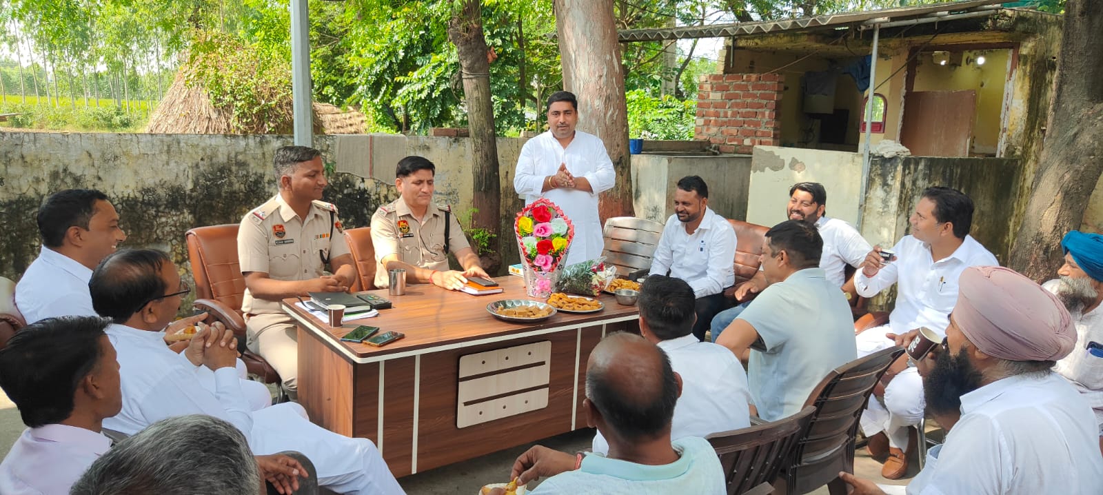 मुलाना (जयबीर राणा थंबड)प्रबन्धक थाना मुलाना प्रमोद राणा व पुलिस चौकी इंचार्ज कलालटी ASI विश्व बंधु द्वारा पुलिस चौकी कलालटी में आने वाले गांवों के सरपंचों व मौजीज व्यक्तियों की पुलिस चौकी कलालटी में मीटिंग रखी गई जिसमें गांव के सरपंचों व मौजीज व्यक्तियों से निवेदन किया गया कि कानून व्यवस्था व ट्रैफिक नियमों का पालन करने बारे कहा गया और छोटे बच्चों को मोटरसाइकिल वगैरा ना चलाने बारे तथा गांव में बढ़ रहे नशे को रोकने के लिए युवाओं को खेलों की तरफ अग्रसर करने के लिए निवेदन किया गया तथा एरिया में यदि कोई संदिग्ध दिखे तो उसके बारे में तुरंत पुलिस को सूचना देने बारे अवगत करवाया गया।