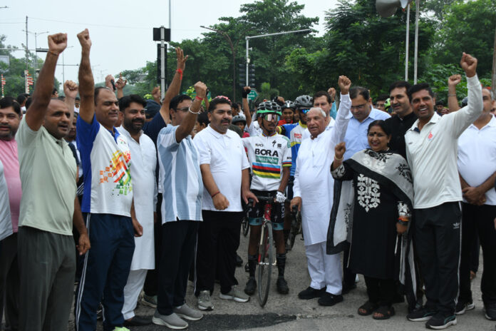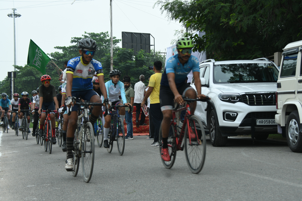 करनाल के एनडीआरआई चौक पर खेल दिवस के उपलक्ष में आयोजित की गई साइक्लोथॉन रैली