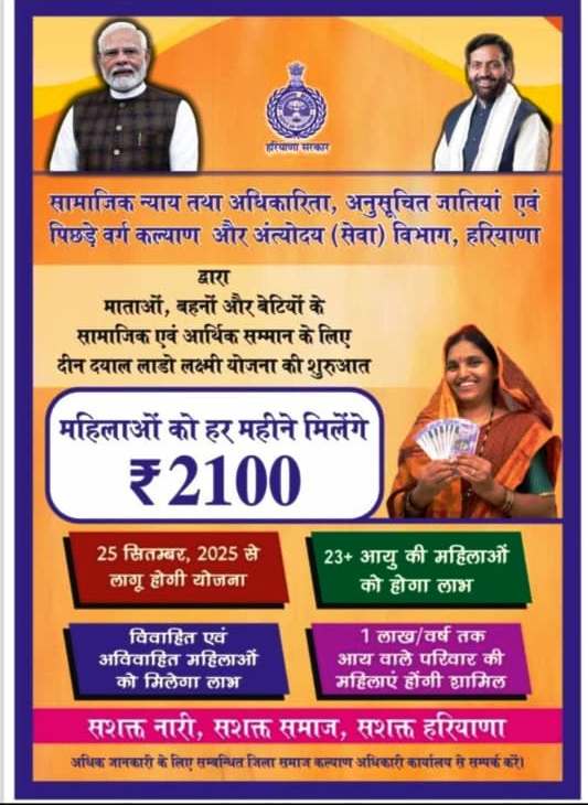 दीन दयाल लाडो लक्ष्मी योजना के अंतर्गत पात्र महिलाओं को मिलेगा प्रतिमाह 2100/- रुपये का लाभ